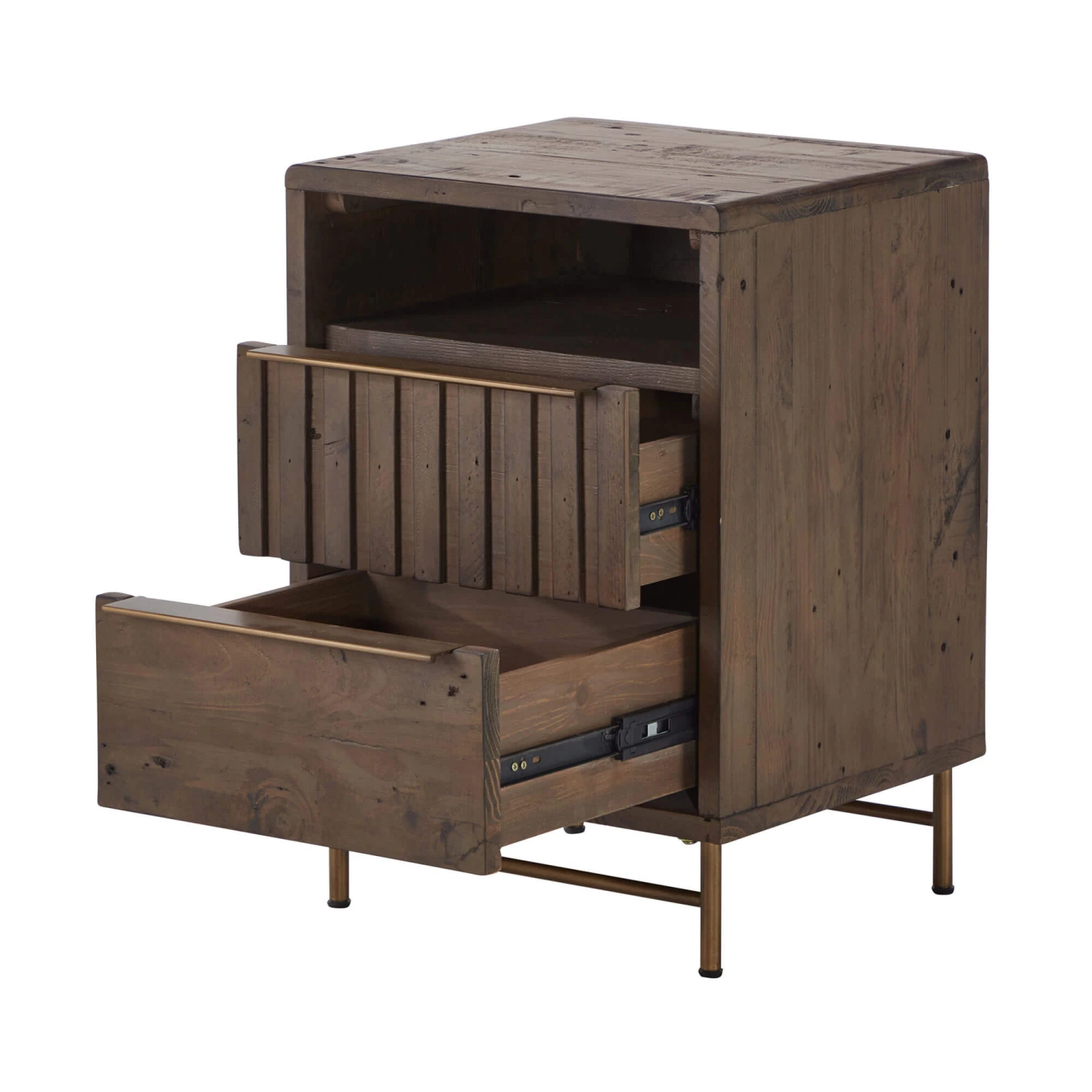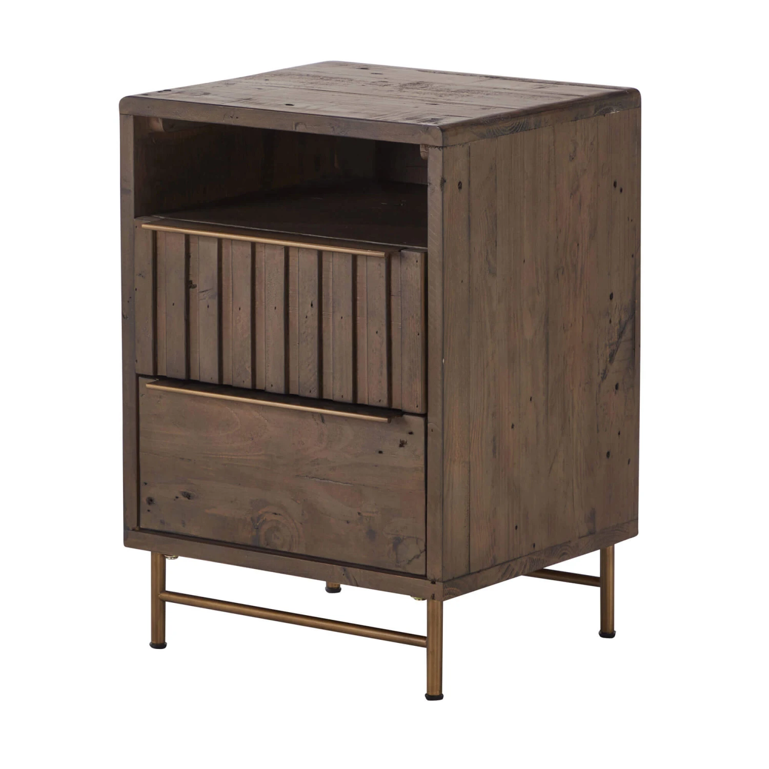 A Bedside table that brings the feeling of rustic elegance to your space. Crafted from solid pine, the unit showcases the natural beauty of the wood grain and features a unique panelled design to add visual interest. With brass coloured handles and legs that add a touch of industrial style, it creates a warm and inviting contrast.