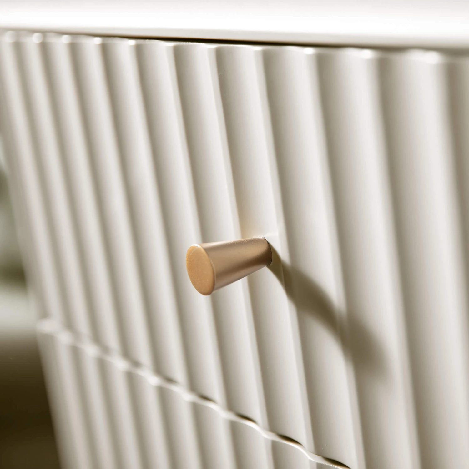 Smart and elegant with a retro flair, the Annette Ivory bedroom collection is packed with character and features a striking corrugated design, perfect for creating an eye-catching, yet timeless bedroom space. Finished in a versatile ivory colourway, the Annette chest brings a soothing aura whilst the distinctive brushed gold metal handles add an industrial finishing touch.