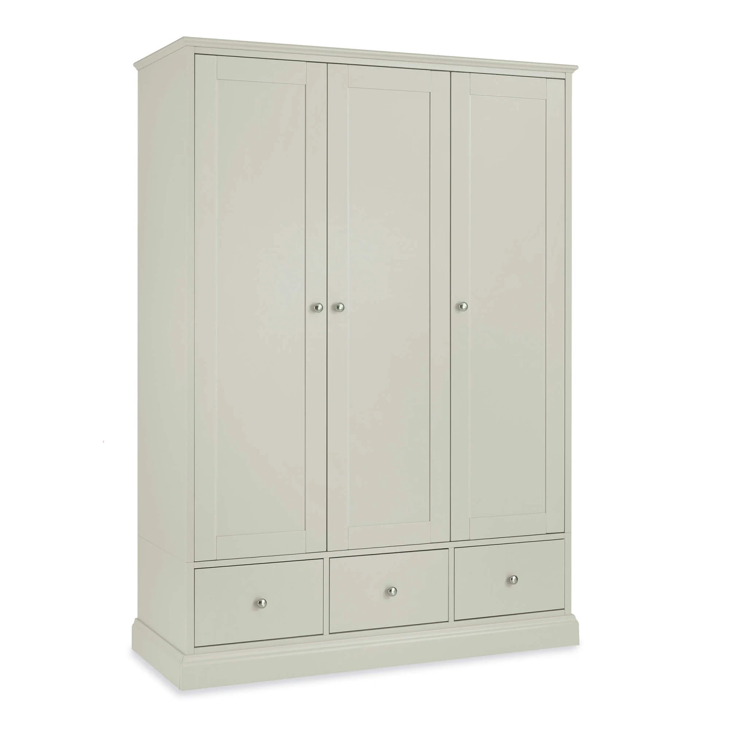 The Ascot Soft Grey 3 Door Wardrobe has a spacious double door opening with an interior hanging rail, plus a single door opening complete with an internal shelving unit. Three external drawers at the bottom of the wardrobe provide practical additional storage space, ideal for folded clothing or seasonal items.