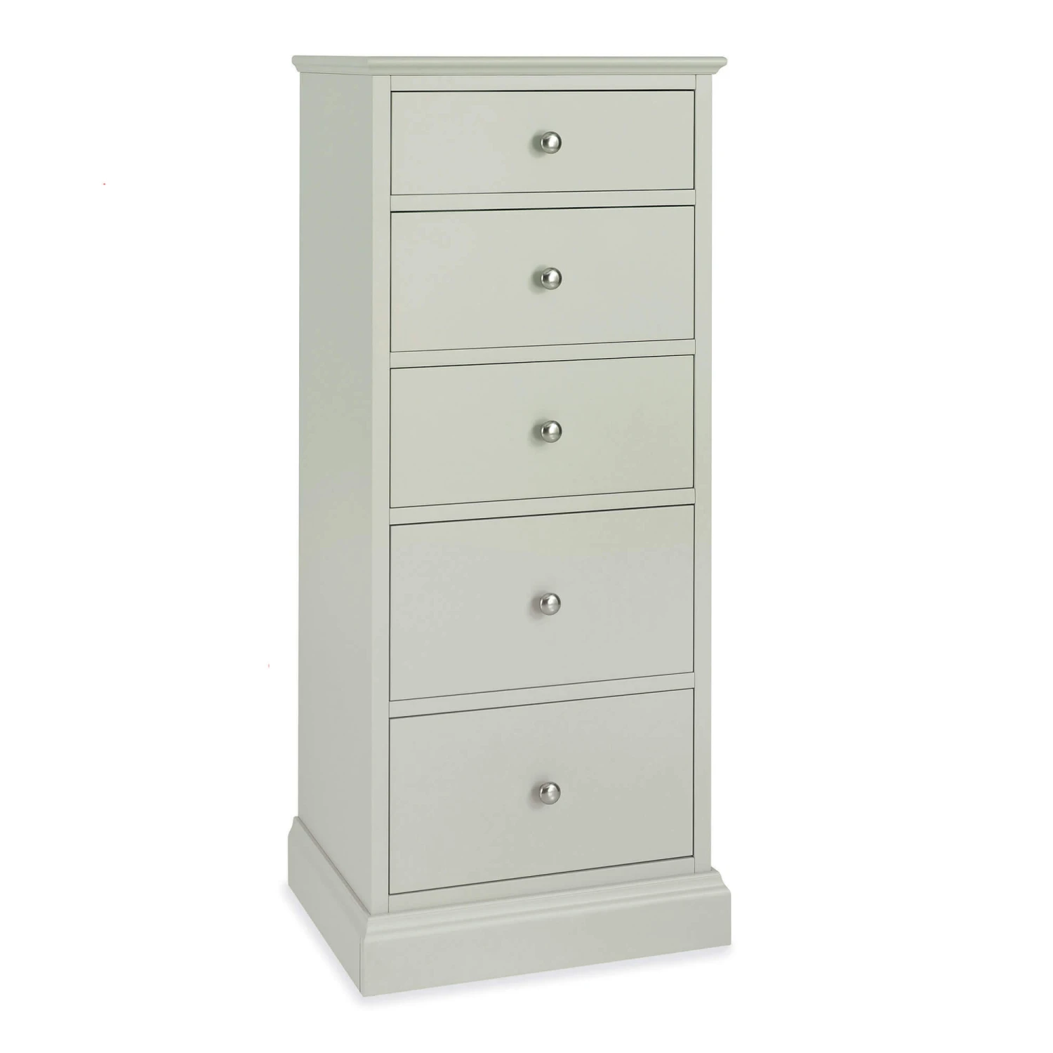 The Ascot Soft Grey 5 Drawer Tall Chest provides ample storage space for clothing and accessories, perfect for t-shirts, nightwear or any other folded garments.