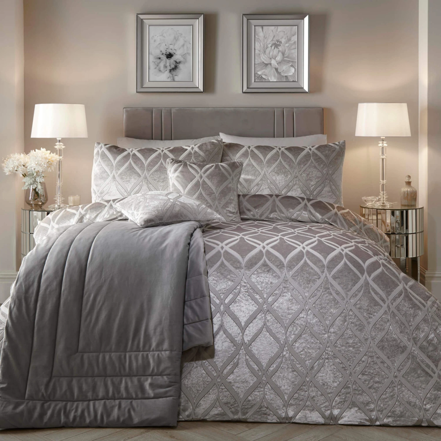 The Belfort silver duvet set features a gorgeous ogee style geometric jacquard design, which has been enhanced by shimmering threads to add an exquisite finishing touch to the bed linen. Crafted from a suptuously soft velvet fabric & complete with two pillowcases, the Belfort silver duvet set will bring a contemporary elegance to any bedroom.
