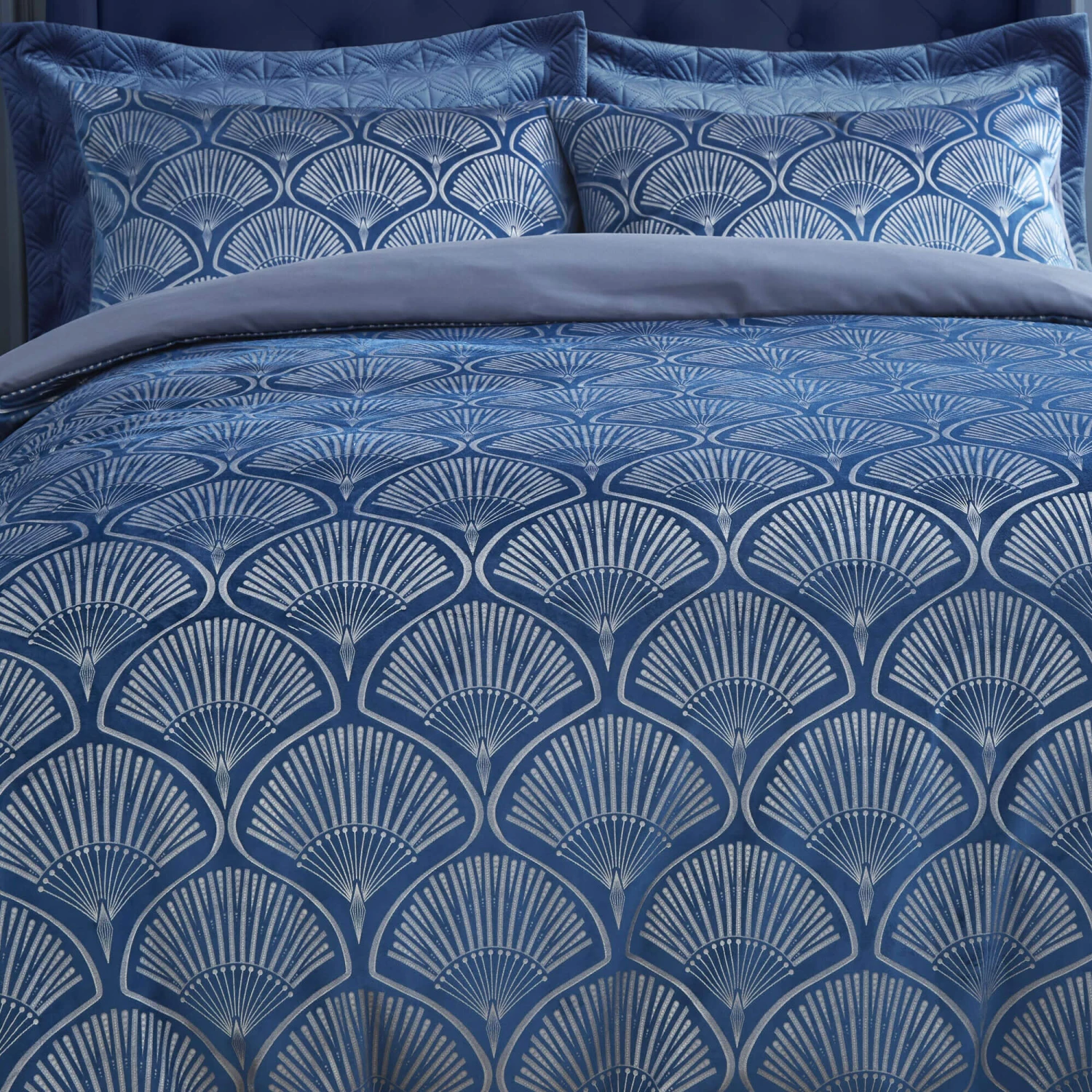 Introduce a touch of glamour to your bedroom with the stunning Art Deco Navy & Pearl Superking Duvet Set from Catherine Lansfield. Crafted from 100% polyester, the navy background provides a sophisticated contrast to the intricate patterned shell fan design, which is given a touch of luxury with a shimmer pearl finish. Included with pillowcases, this duvet set is not only stylish but also elegant and comfortable.