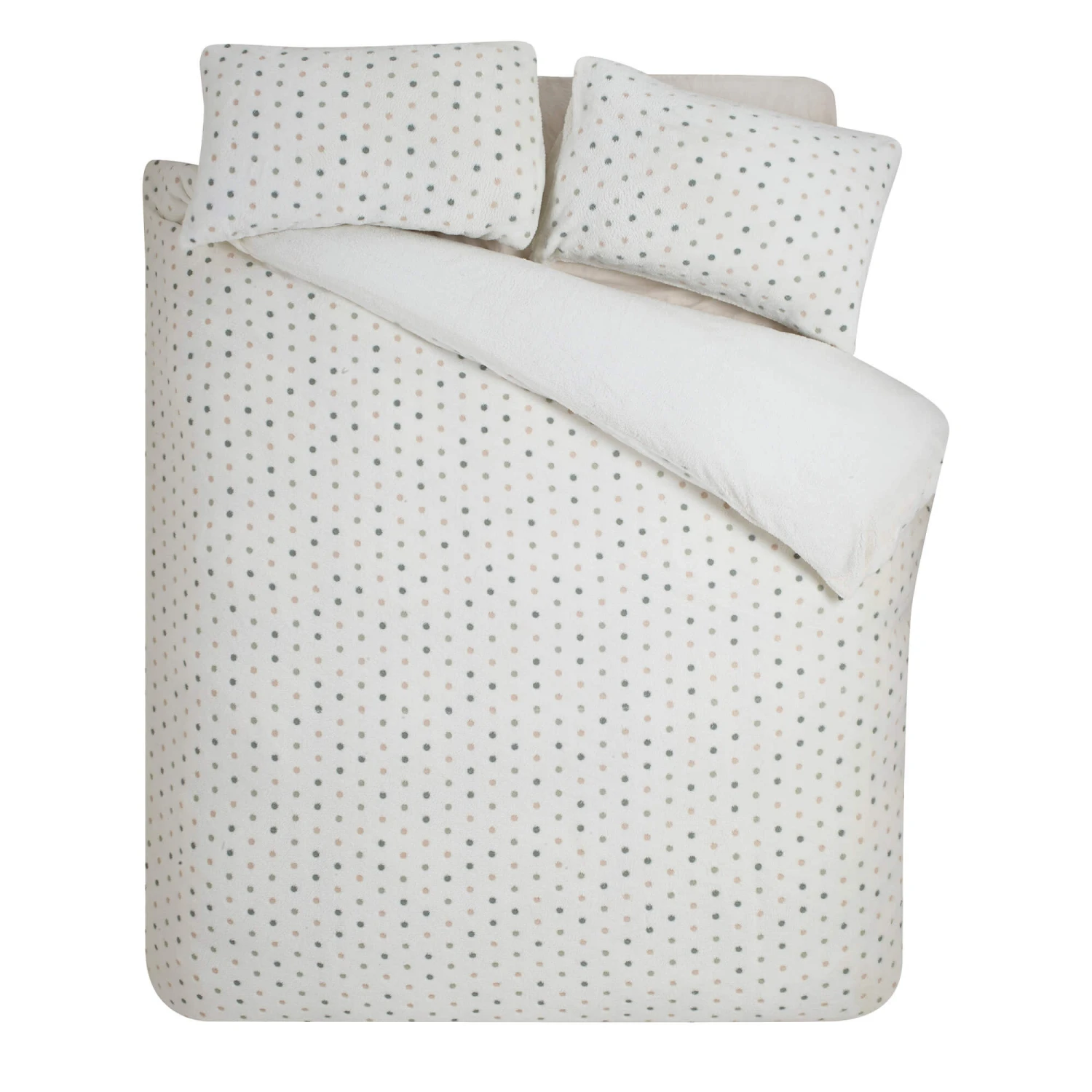 Add a touch of timeless charm to your bedroom with the Cosy Spot Cream Kingsize Duvet Set from Catherine Lansfield. Featuring an embroidered polka dot design on a soft, neutral base, this bedding set brings a subtle yet stylish feel to your bedroom. Crafted from cosy fleece, offering a wonderfully soft and inviting texture, while the plush sherpa reverse provides extra warmth and cosiness, perfect for chilly nights.