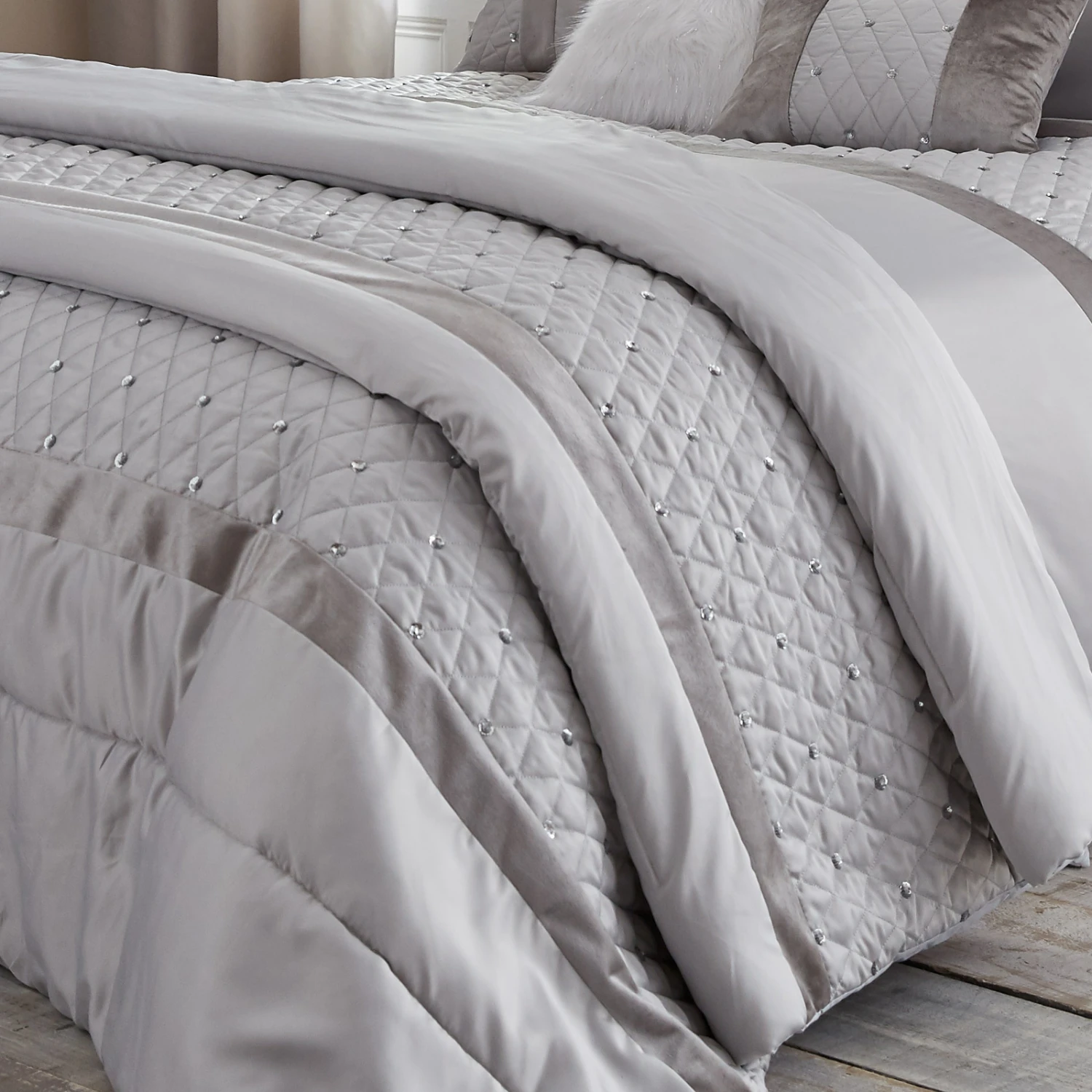 This delightful Sequin Cluster silver bedding collection from Catherine Lansfield is a stunning contemporary update on traditional bedding. It’s full of timeless elegance in an exquisite white colour scheme, with a silver panel running across the header to add a pop of personality. Quilted-effect embellishments bring detail to the look, while clusters of perfectly placed sequins softly shimmer. It’s finished with a pair of velvet bands that border this panel and create a sophisticated appearance that’s easy to love.