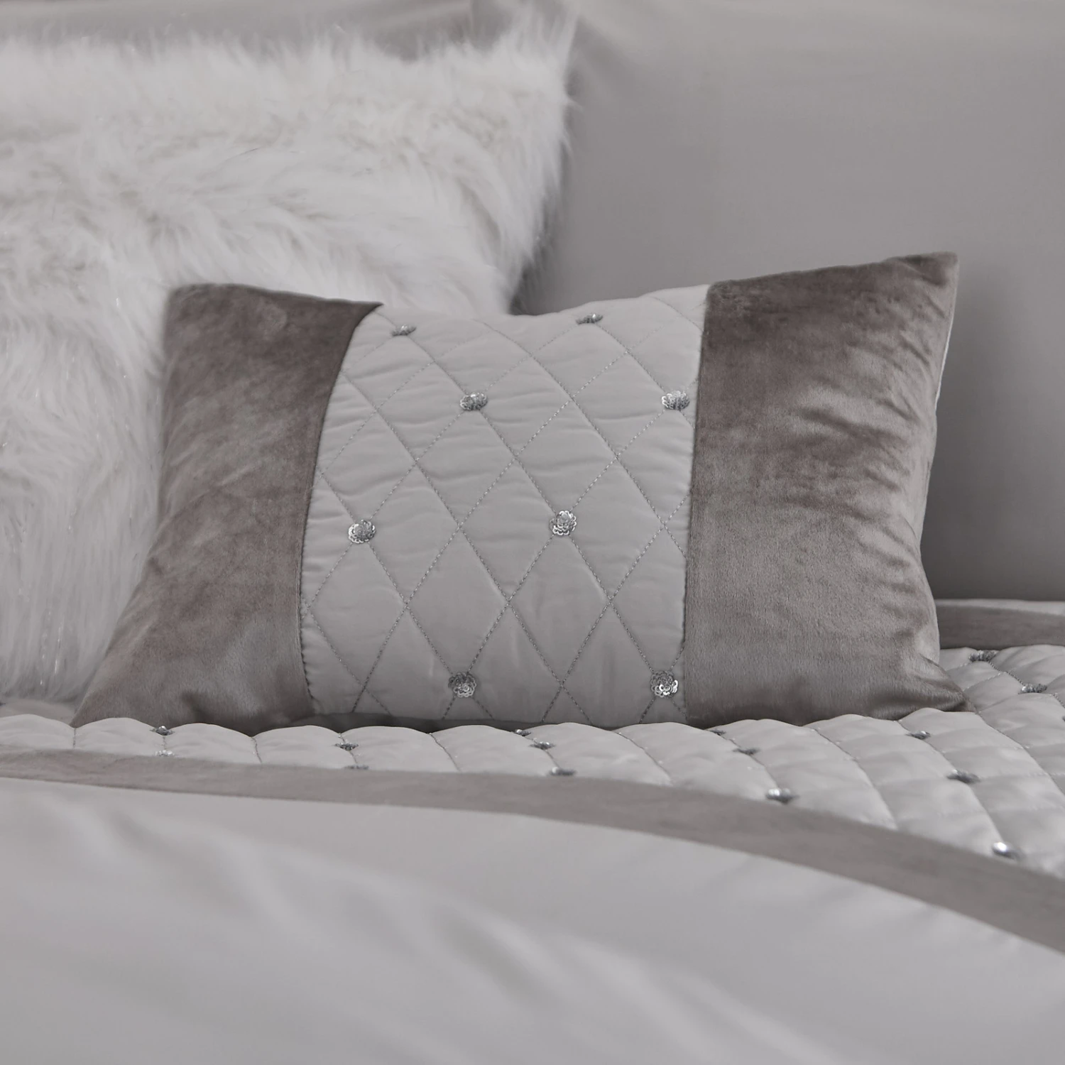 This delightful Sequin Cluster silver cushion from Catherine Lansfield is a stunning contemporary update on traditional bedding. It’s full of timeless elegance in an exquisite white colour scheme, with a silver panel running across the header to add a pop of personality. Quilted-effect embellishments bring detail to the look, while clusters of perfectly placed sequins softly shimmer. It’s finished with a pair of velvet bands that border this panel and create a sophisticated appearance that’s easy to love.