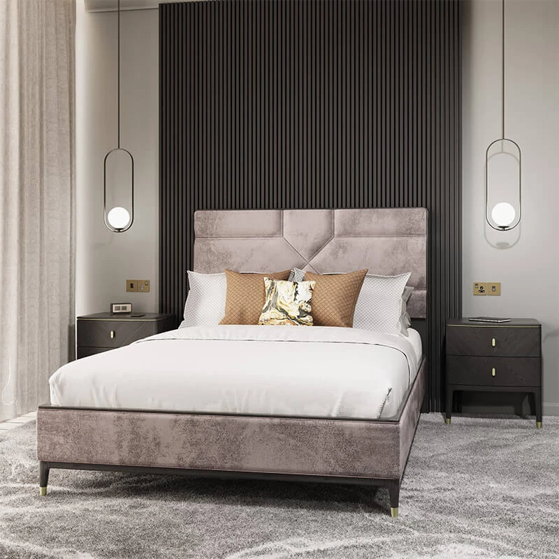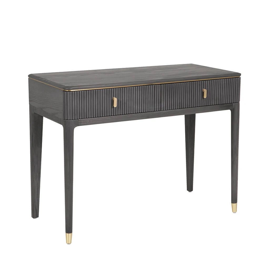 Slim tapered legs create a streamlined silhouette, with gold coloured feet enhancing the contemporary look perfectly. A gold coloured inlay around the furniture tops adds a striking finish touch, whilst selected drawer fronts feature a ridged paneling effect for the ultimate unique and contemporary aesthetic.