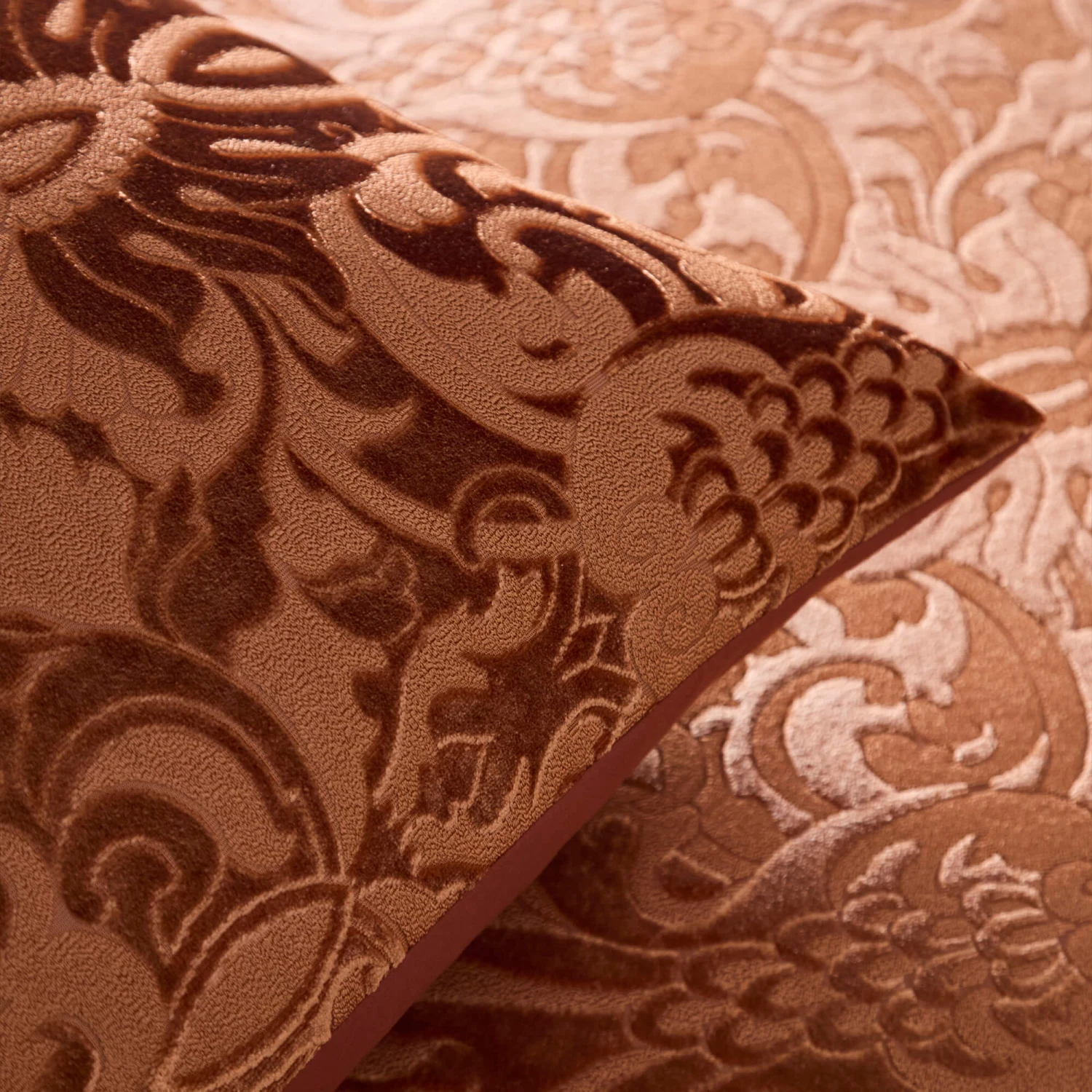 A vibrant orange bedding that is made of a soft velvet. This superking bedding set features an embossed baroque style pattern that produces a subtle sheen adding a luxurious feel to the bedding whilst remaining soft to the touch.