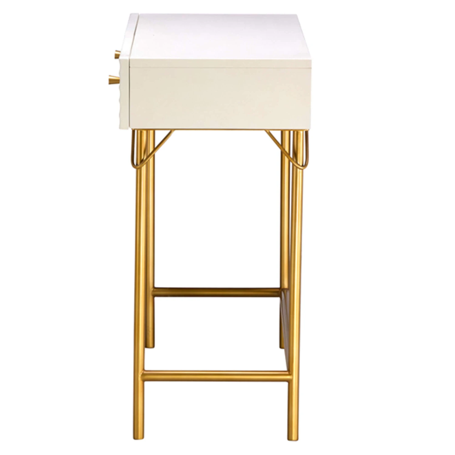 Smart and elegant with a retro flair, this Lisette White 2 Drawer Dressing Table is packed with character and features a striking corrugated design, perfect for creating an eye-catching, yet timeless bedroom space. Finished in a versatile white colourway, the Lisette dressing table brings a soothing aura whilst the distinctive brushed gold metal handles add an industrial finishing touch.