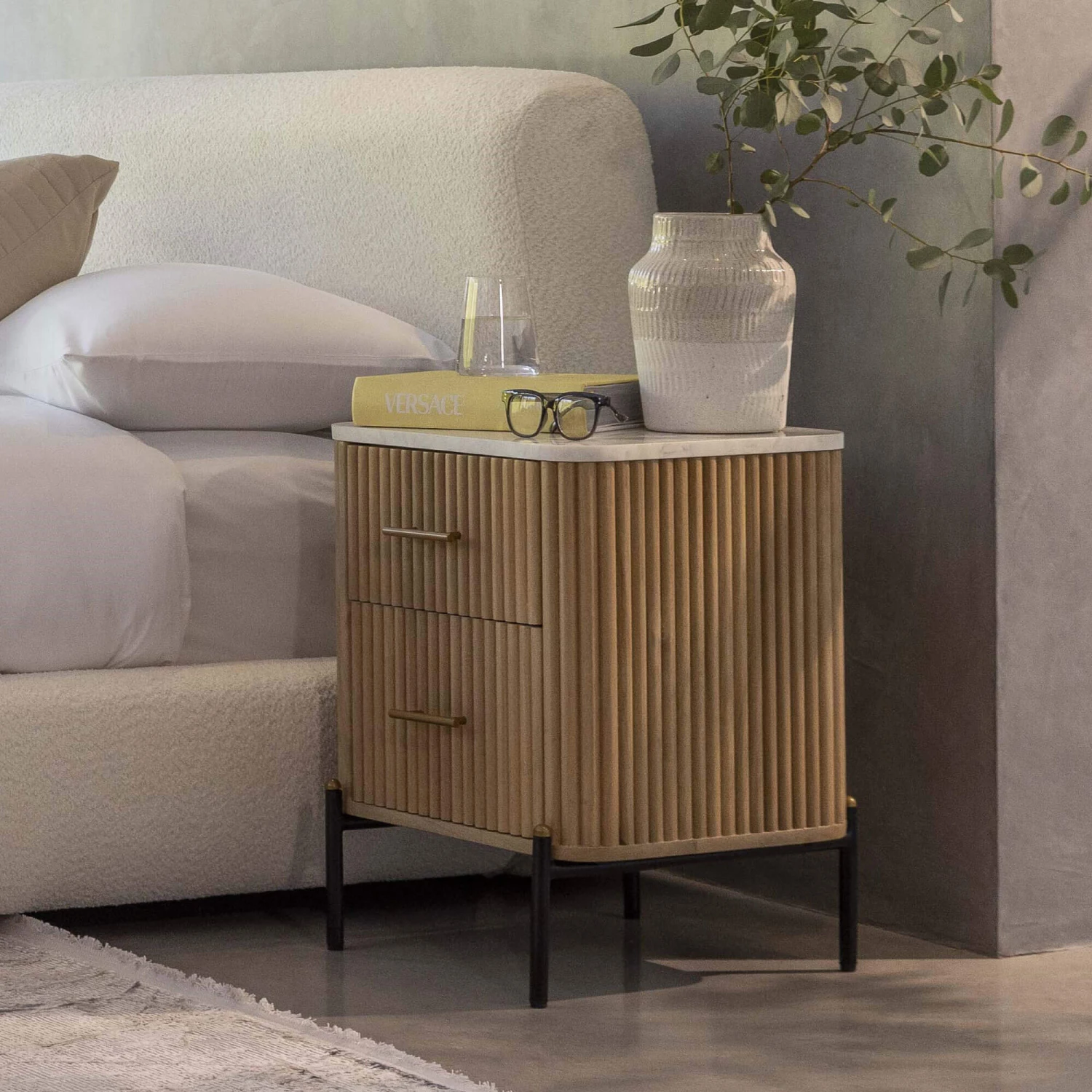 Celebrating the raw beauty of natural materials in a contemporary design that speaks for itself, the Rochelle Mango Wood & Marble 2 Drawer Bedside Chest is a marvel to behold with its visually striking, modern design that is sure to take pride and place in any bedroom.