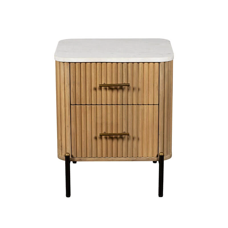 Defined by a remarkable reeded carcass, crafted from a stunning, natural mango wood with a white wash finish, the Rochelle has a certain charm that is sure to enhance its surroundings. The soft, rounded edges and outline lend this bedside chest an almost light and airy quality, whilst the polished finish of the refreshing marble top further adds to the allure of this piece.
