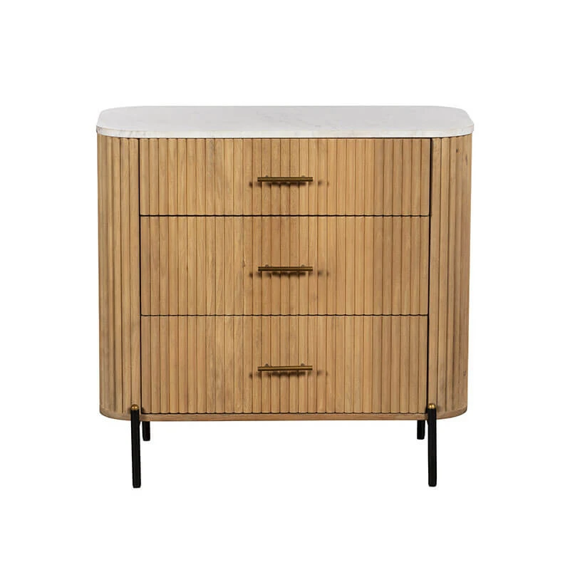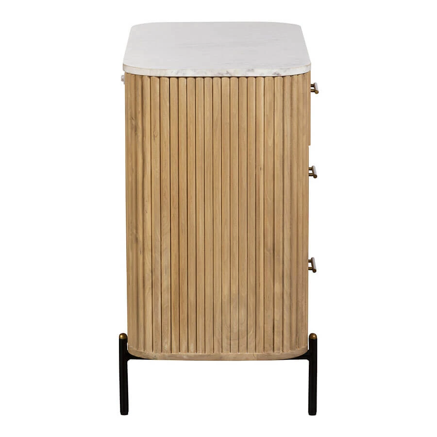 Defined by a remarkable reeded carcass, crafted from a stunning, natural mango wood with a white wash finish, the Rochelle has a certain charm that is sure to enhance its surroundings. The soft, rounded edges and outline lend this chest of drawers an almost light and airy quality, whilst the polished finish of the refreshing marble top further adds to the allure of this piece.
