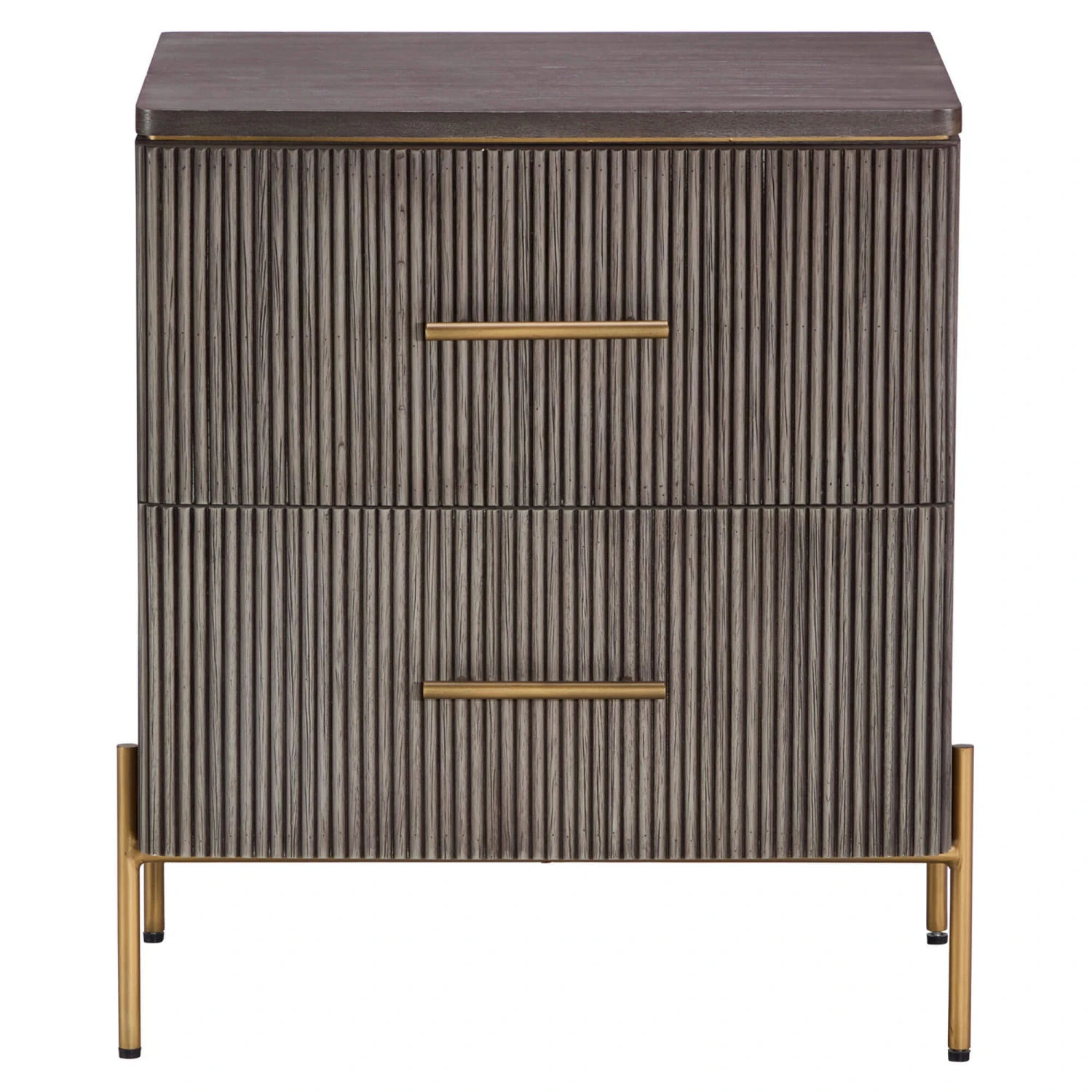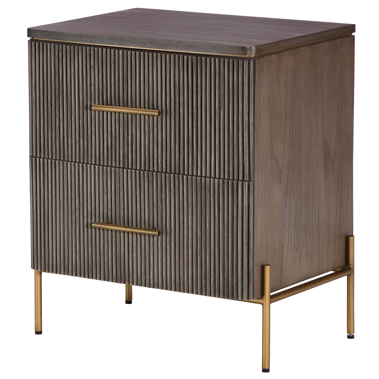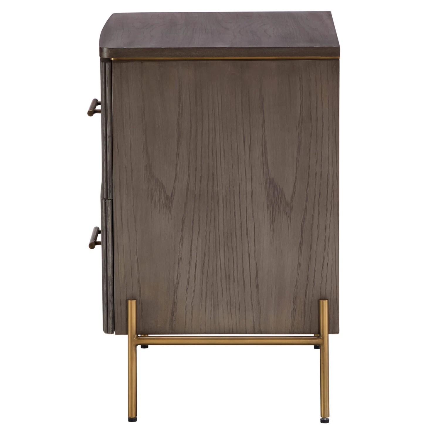 The Rocher Bedside Table will provide your bedroom with a contemporary, elegant feel. The brown colours of the oak wood work perfectly with the gold, metal legs and handles in order to provide your bedroom with a classy, high end feeling. The bedside table features 2 deep drawers that allow you to neatly store things away in order to keep your room looking nice and tidy.