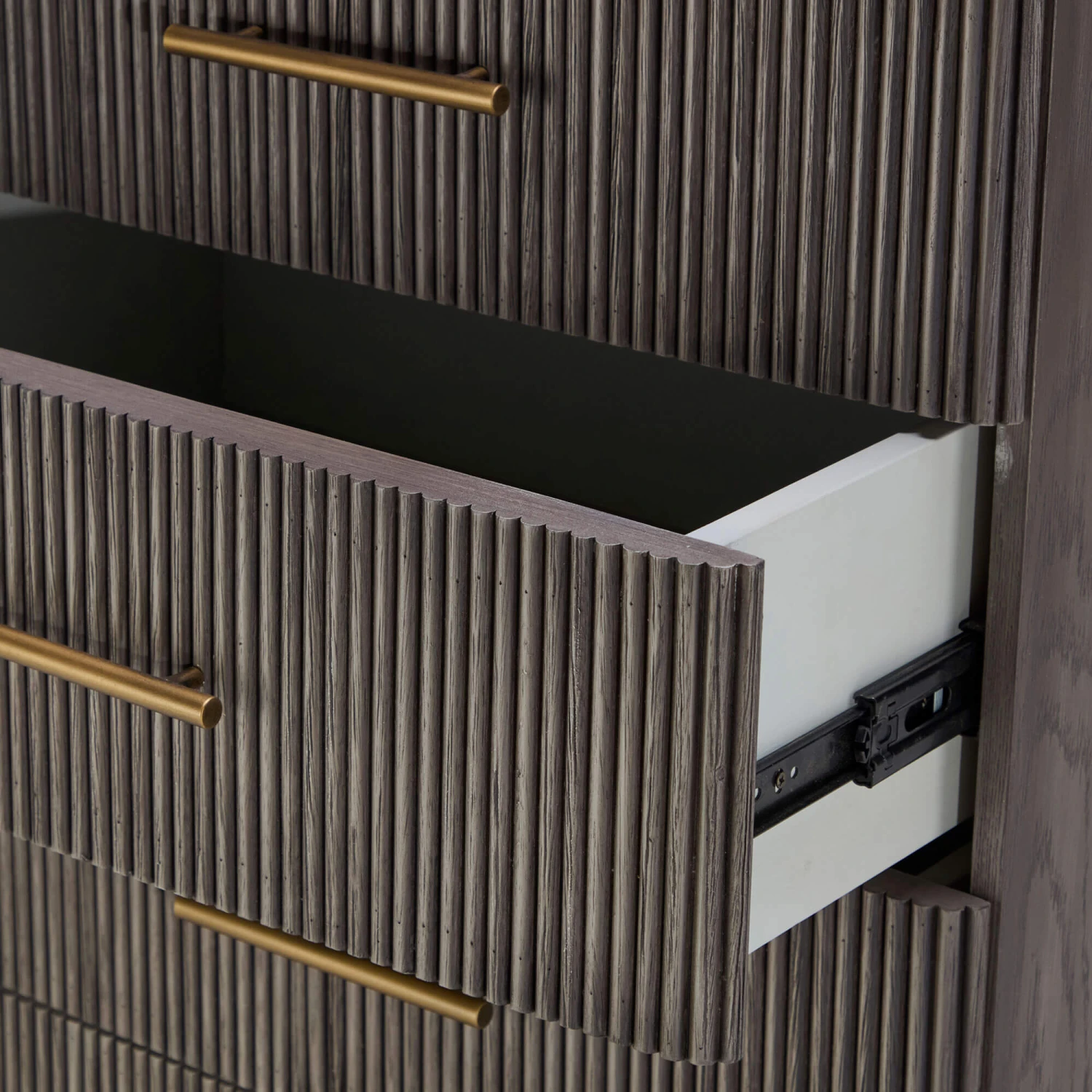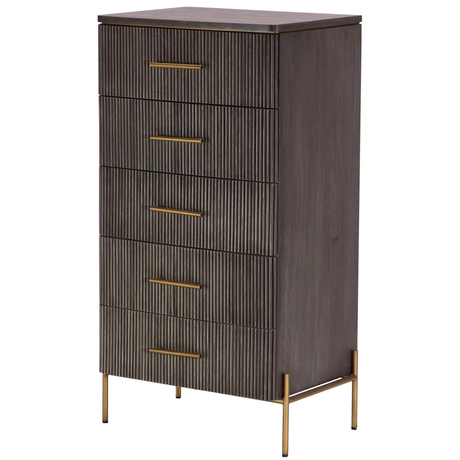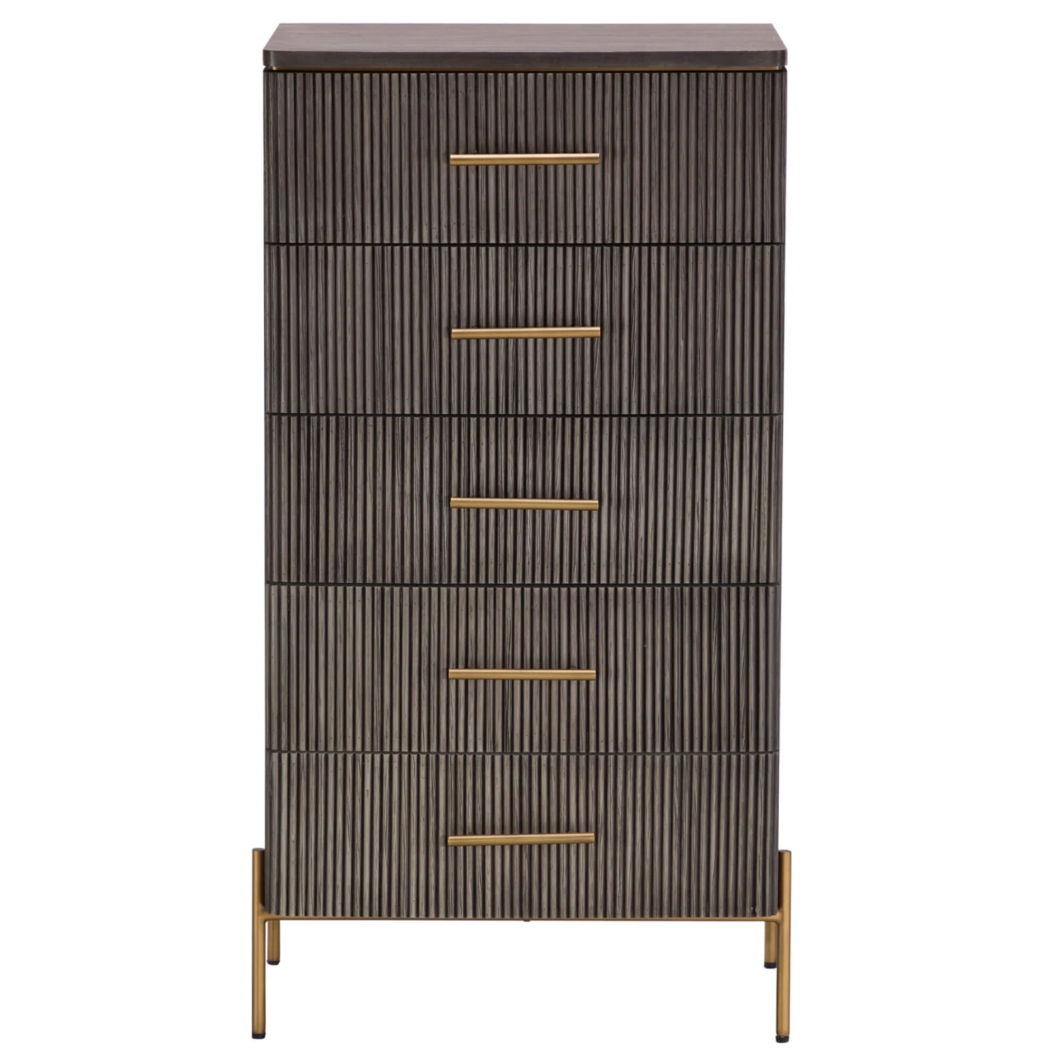 The Rocher Tall Chest Of Drawers will provide your bedroom with a contemporary, elegant feel. The brown colours of the oak wood work perfectly with the gold, metal legs and handles in order to provide your bedroom with a classy, high end feeling. The chest of drawers features 5 deep drawers that allow you to neatly store things away in order to keep your room looking nice and tidy.