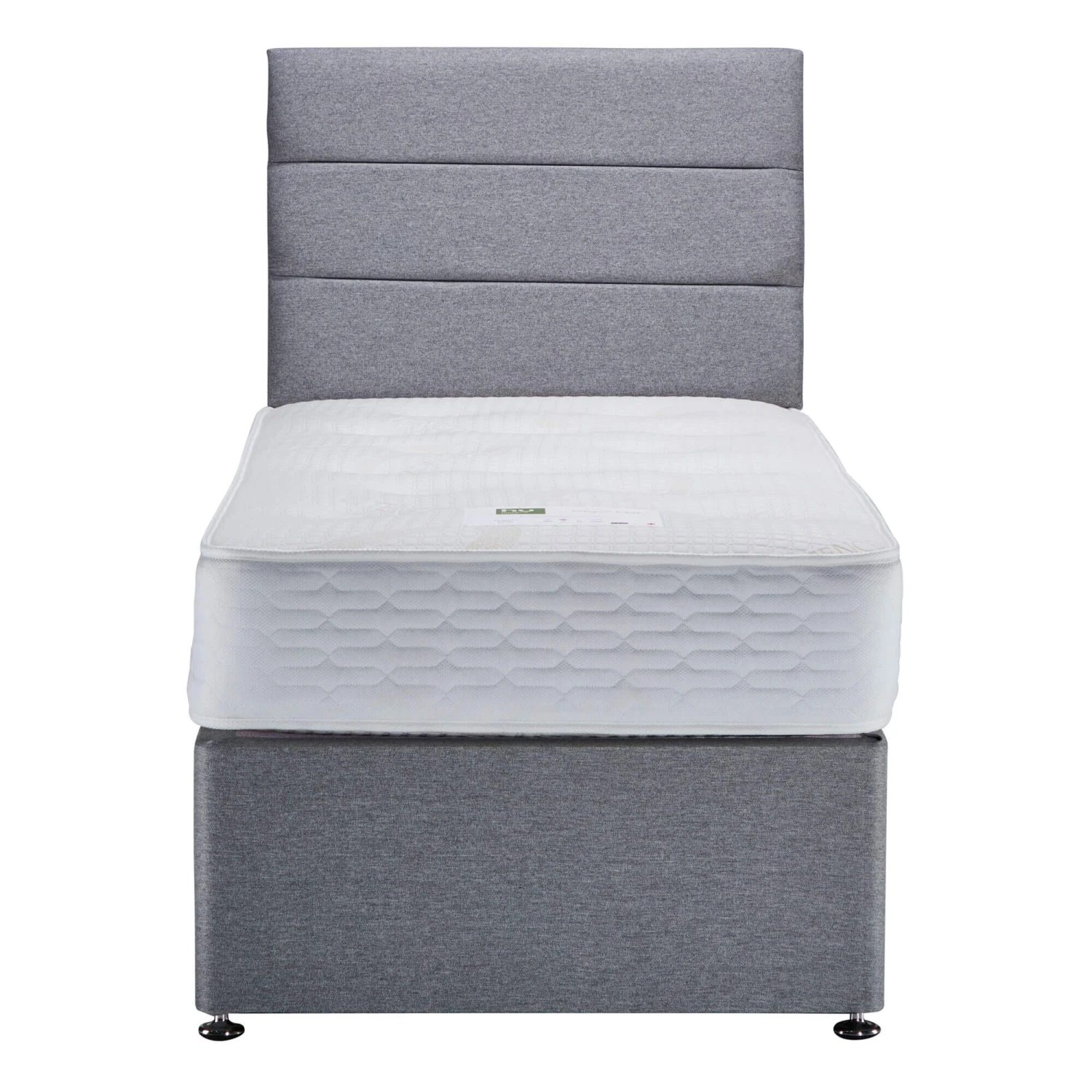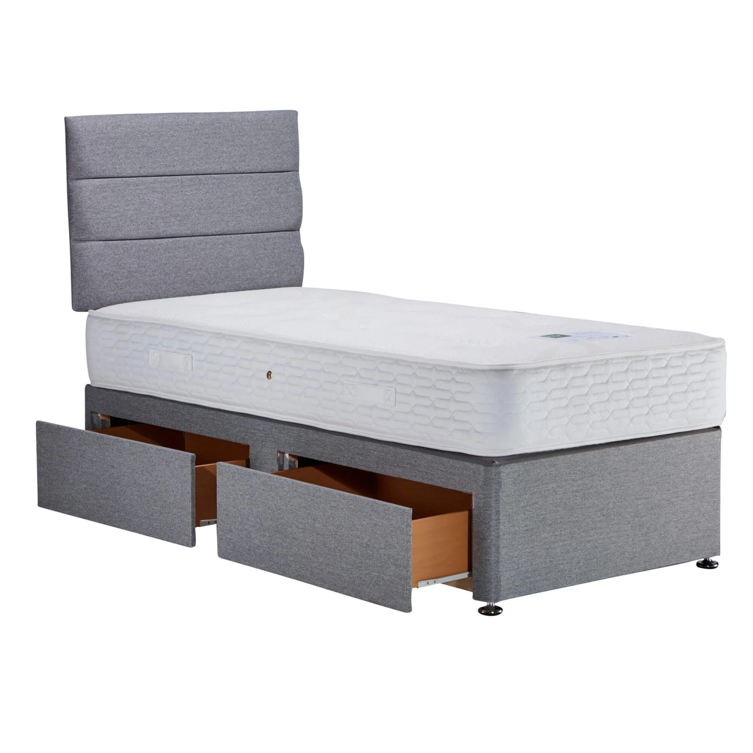 Designed to offer an ultimate in comfort, the Royal Ortho Single 2 Drawer Divan Bed provides superior support and comfort with its specialist features. Featuring an orthopaedic spring unit topped with layers of luxurious responsive fillings, the Royal Ortho Divan Bed has a firm feel and reactive composition; helping to deliver pressure relief and support while you sleep. The durable steel frame provides extra edge to edge support, whilst the 2 drawers located on either side of the base offers a convenient hidden storage solution. Accompanied with its premium Sierra Silver fabric that graces the base of the bed, the Royal Ortho Divan is a highly comfortable and supportive, quality bed that is sure to compliment and make a practical addition to a wide array of interiors.