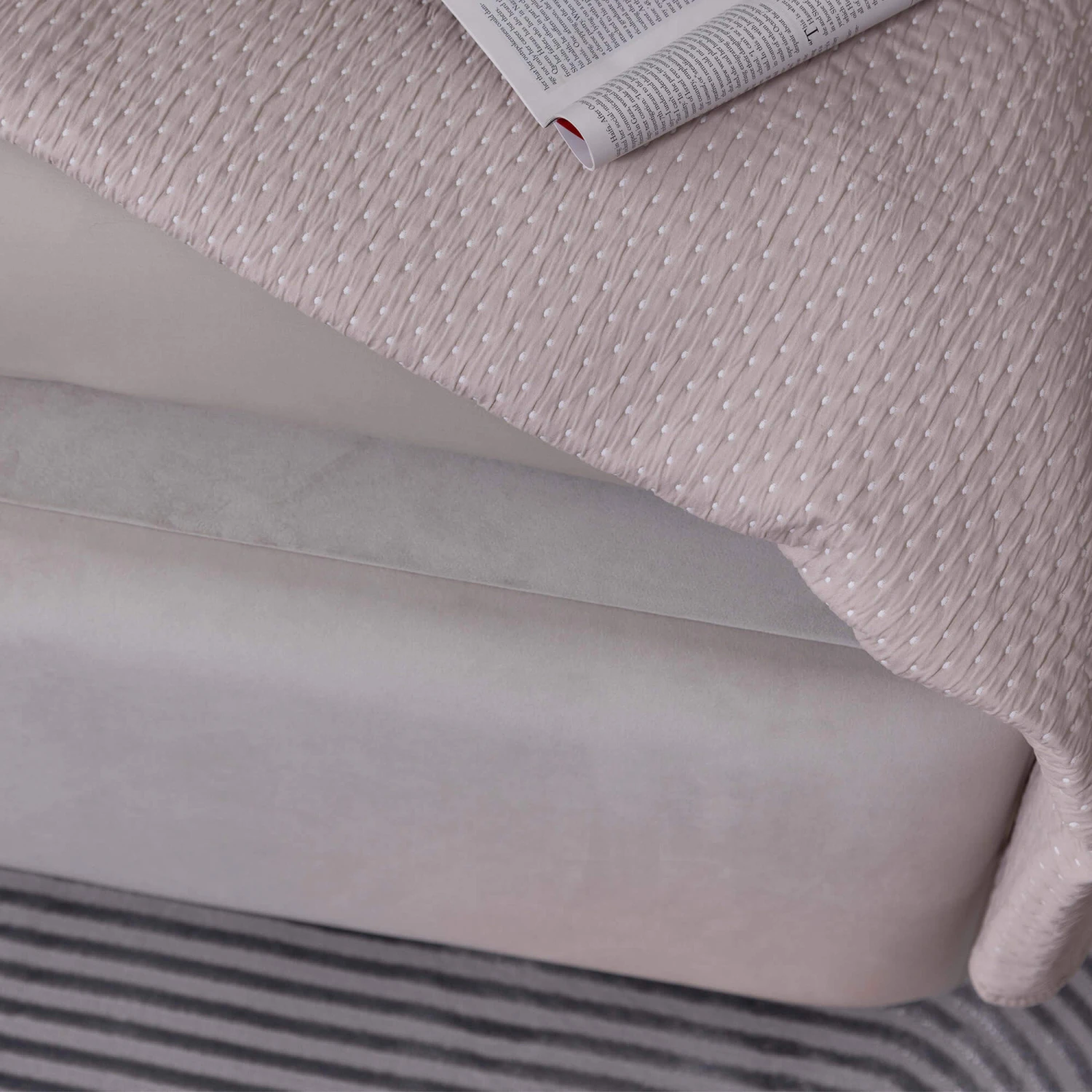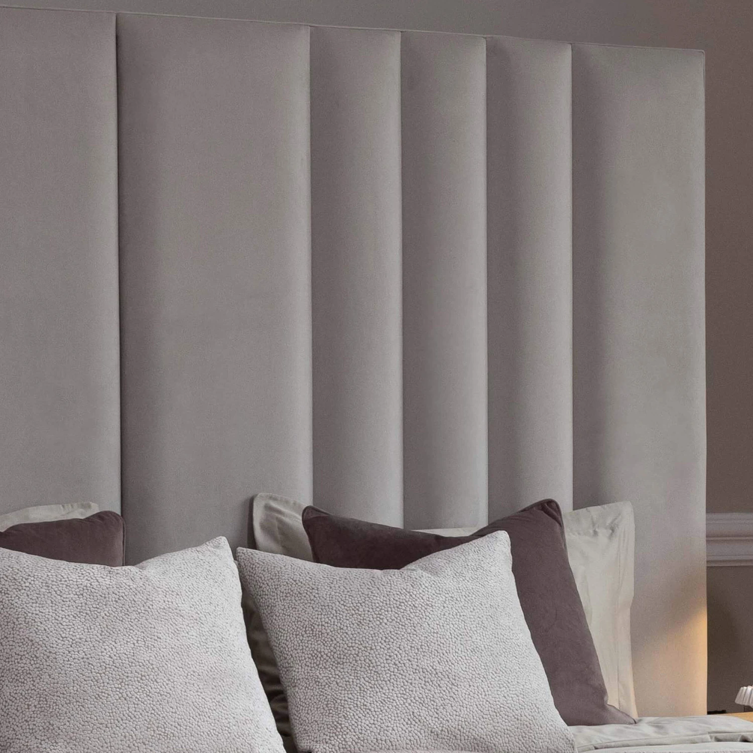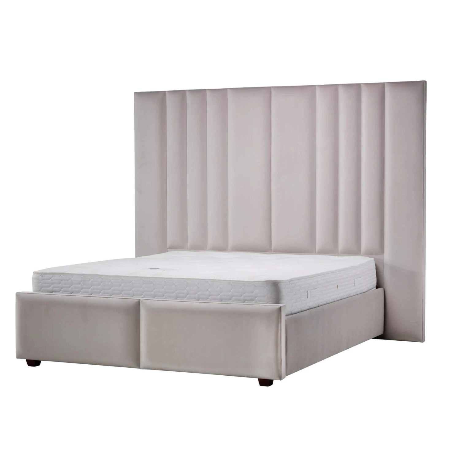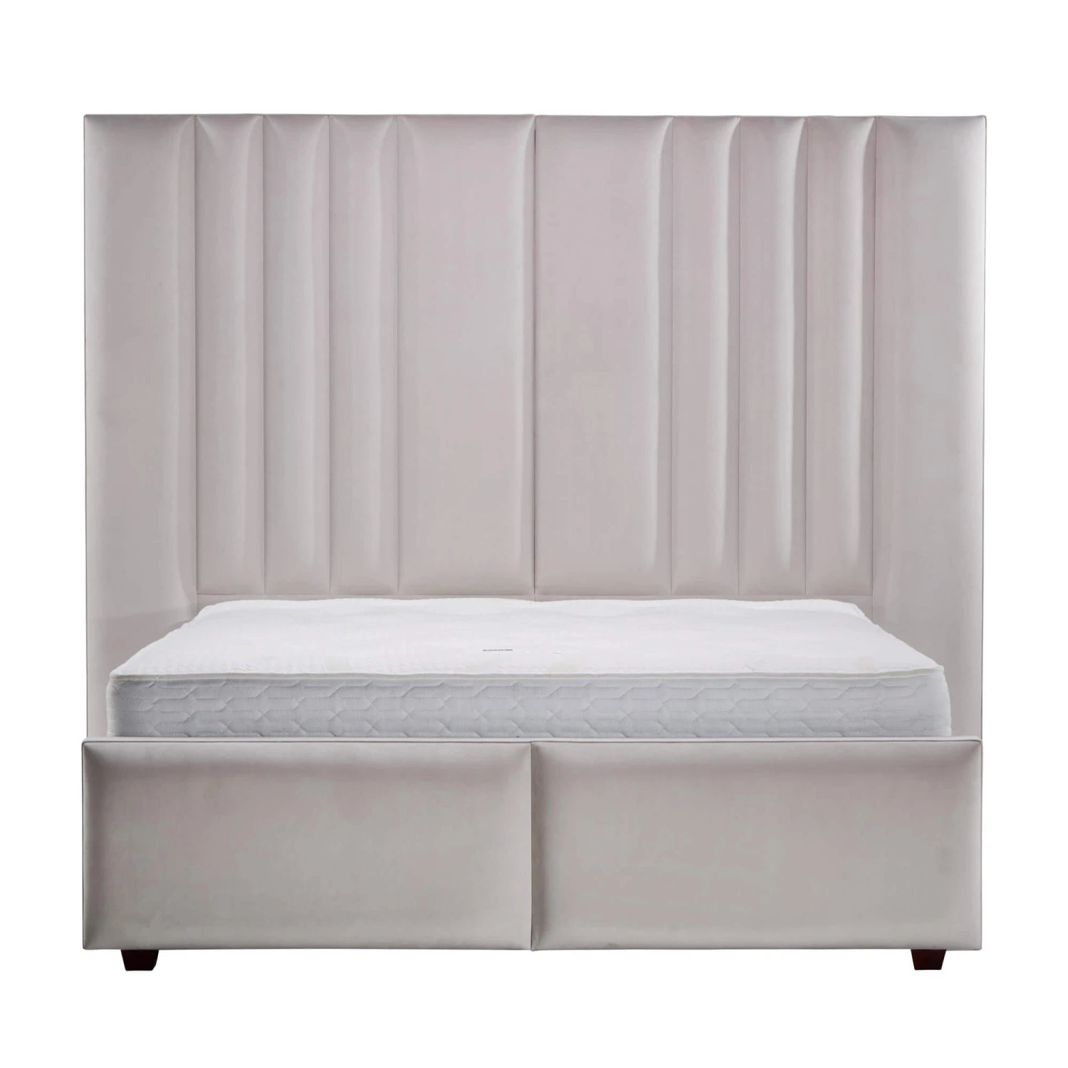 This stunning bed frame features a tall, hotel height headboard that extends beyond the width of the frame creating a grand focal point in your bedroom. The plush, thick headboard is composed of two panels, each with vertical tufting adding a layer of texture and elegance. The entirely upholstered frame and footboard, finished in a soft, plush velvet, exude a sense of opulence and comfort transforming your bedroom into a serene retreat.