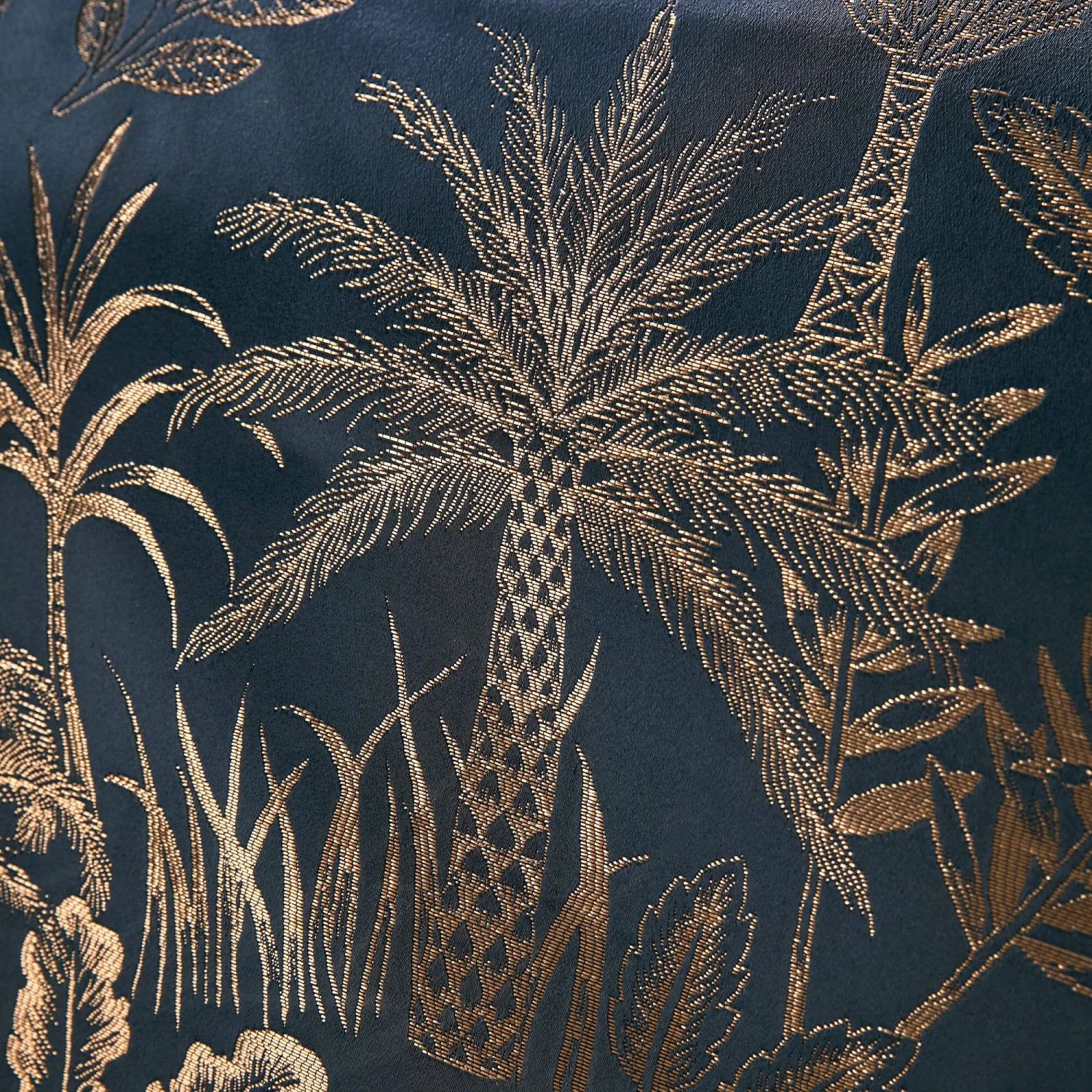 This Soiree Midnight Palm navy Kingsize Duvet Set adds a luxurious feel to your bedroom. The bedding set is a deep navy colour with a gold coloured palm pattern. This duvet set is also made with a metallic yarn to provide a shimmer finish.