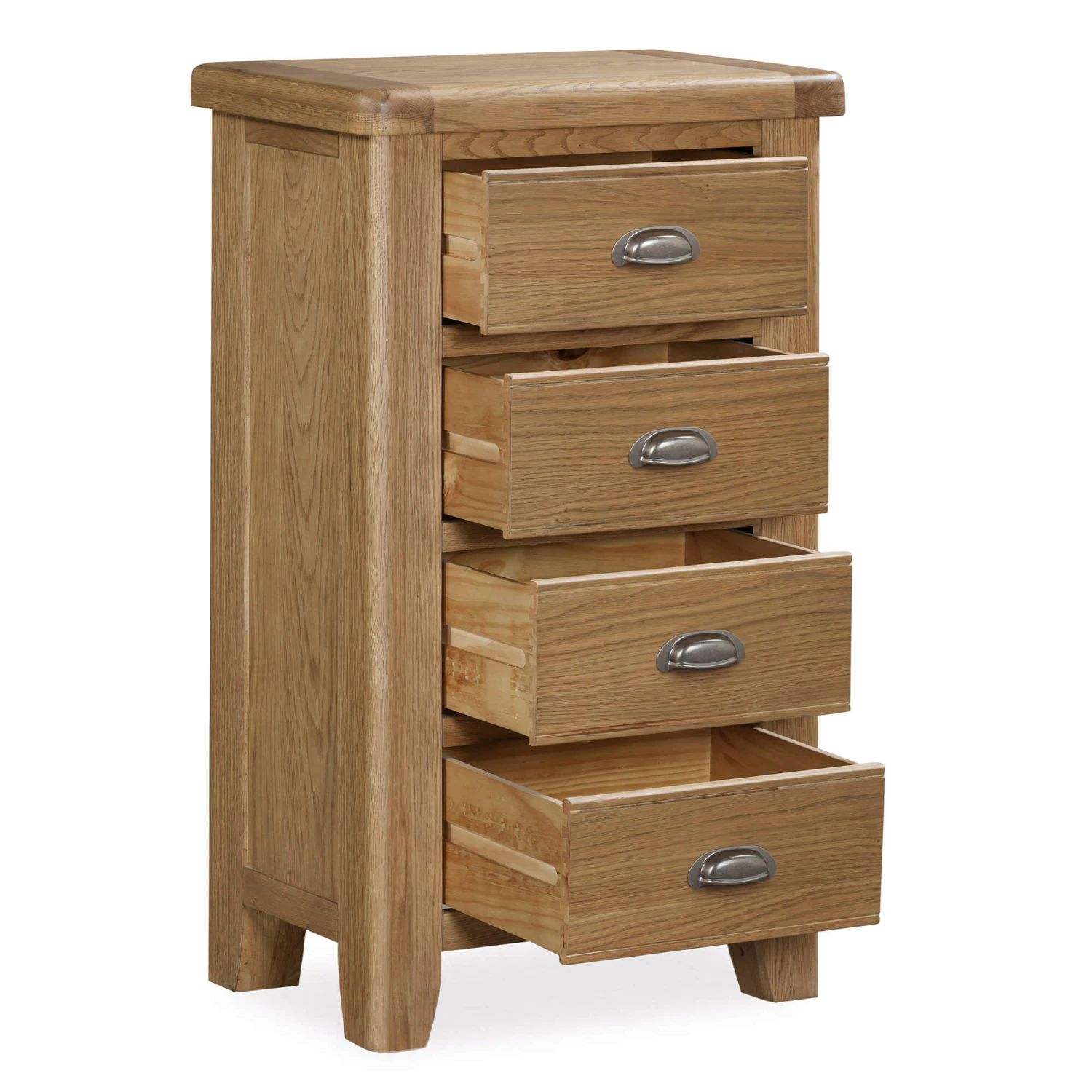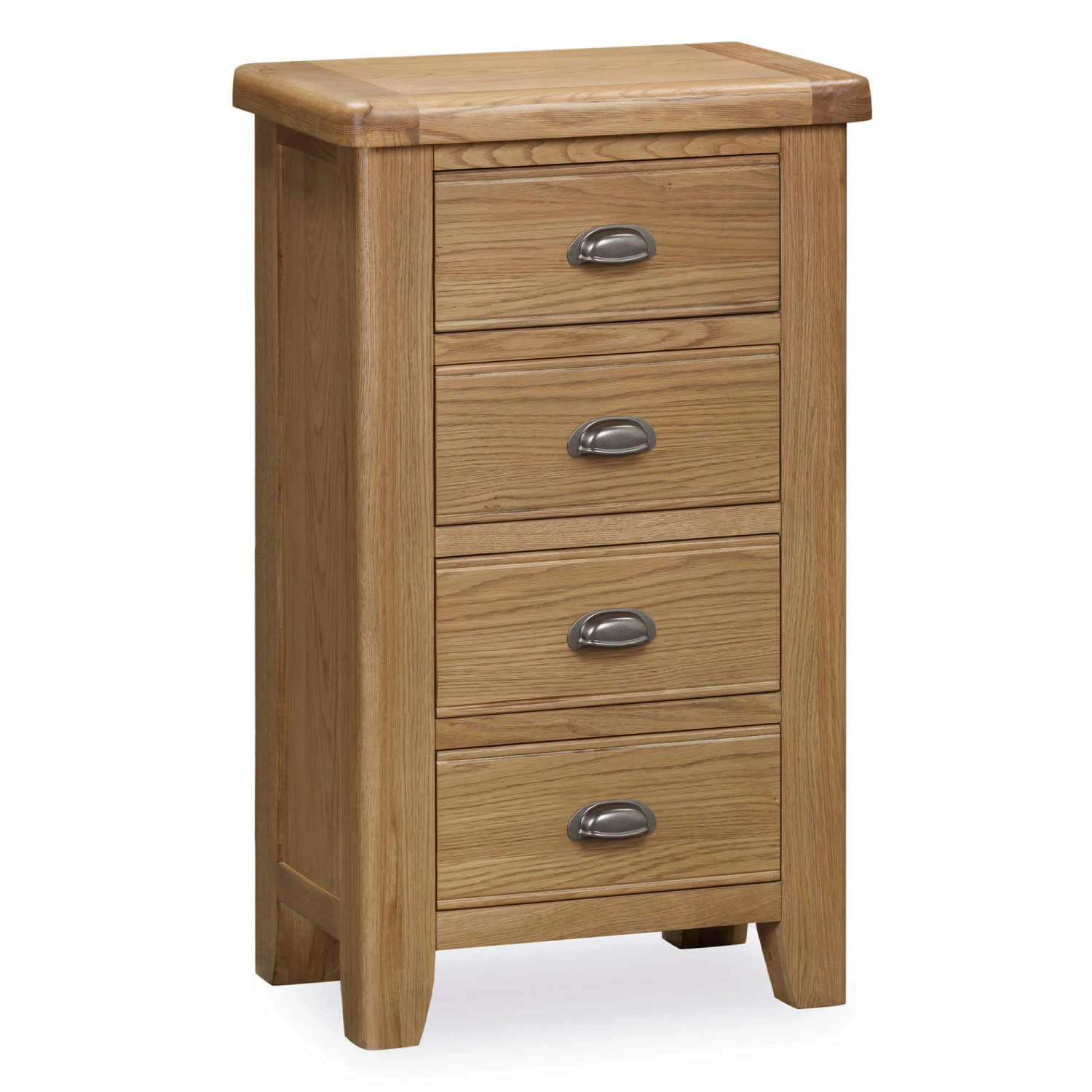 Compact in size yet generous in storage, the Trafalgar 4 Drawer Tall Chest is a practical and stylish solution for keeping your bedroom organised. Expertly crafted from oak and finished in a warm, natural tone, this piece highlights the wood’s beautiful grain while bringing timeless charm to your home. Featuring four neatly stacked drawers, each with a brushed metal cup handle, the Kelso provides ample space for clothing, accessories, or everyday essentials without taking up too much floor space. Its slim profile makes it especially suited to smaller rooms or awkward corners, where storage is needed but space is limited.