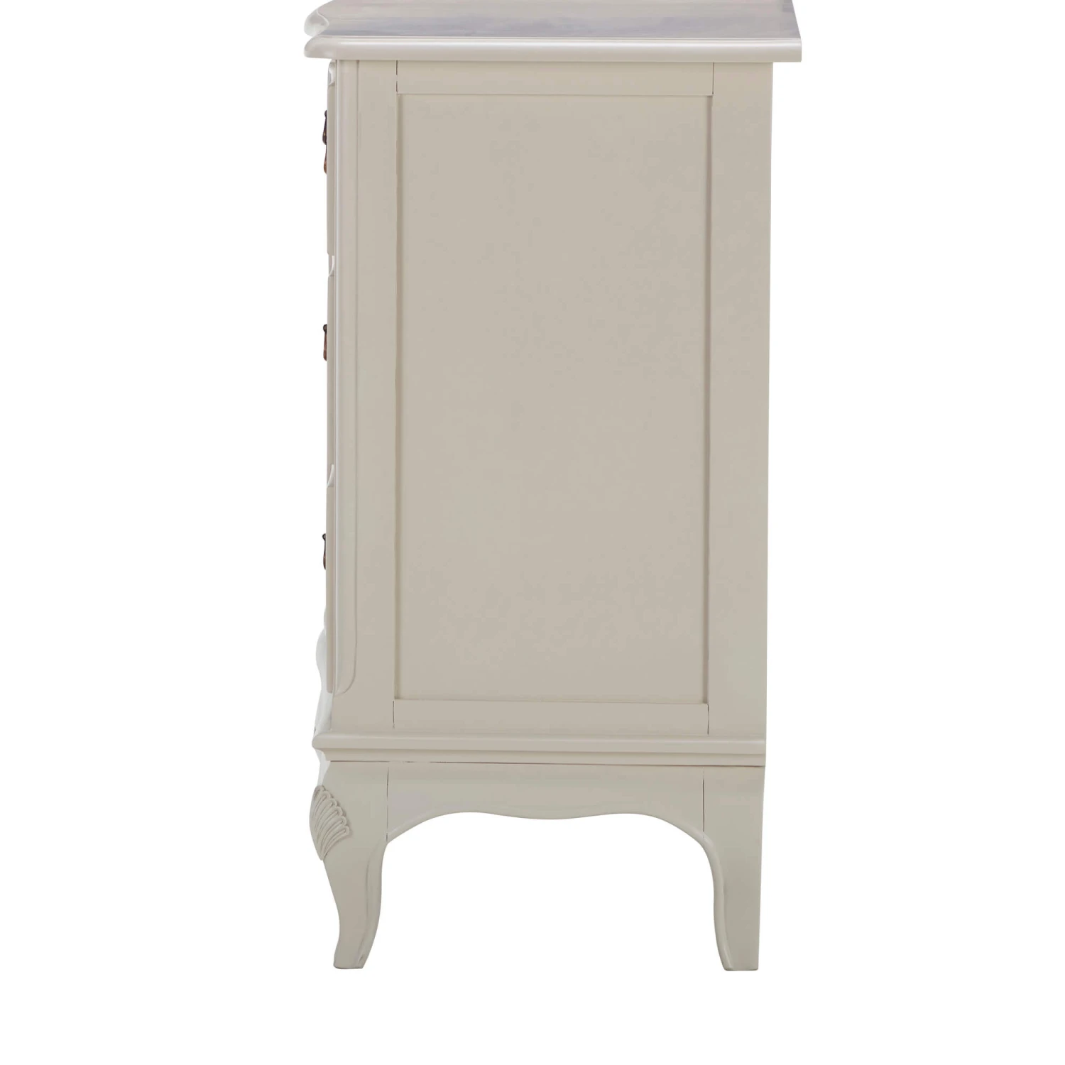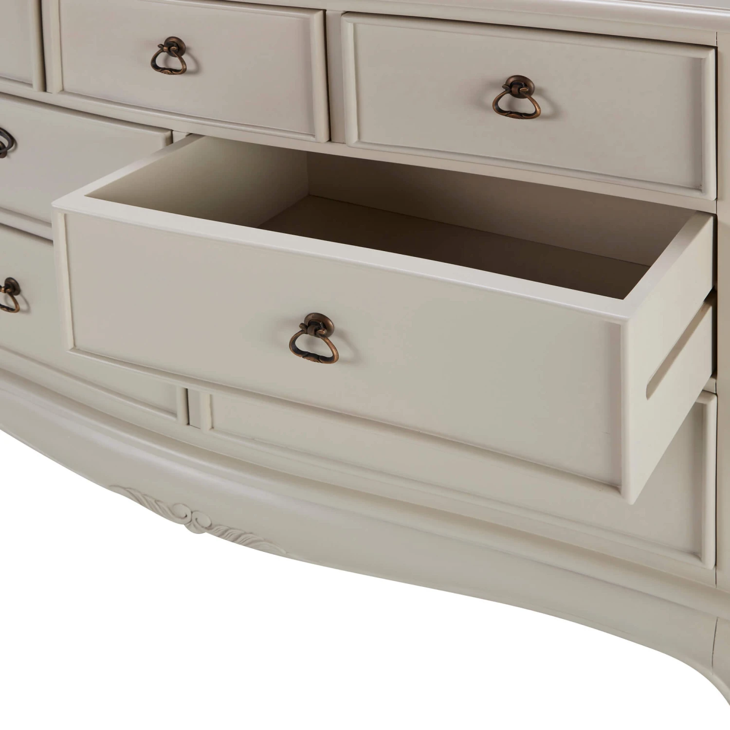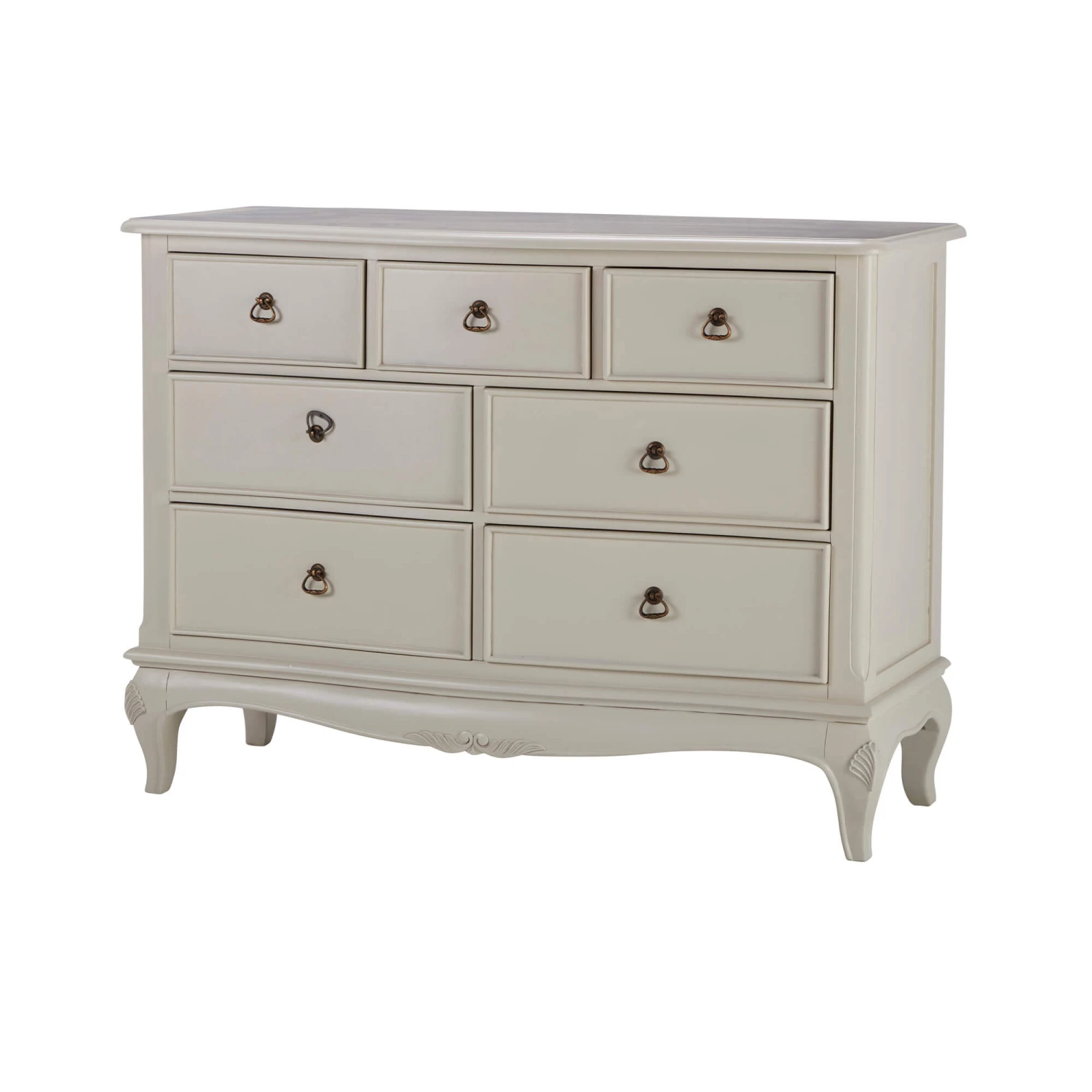 The Versailles collection is a stylish and distinctive range of bedroom furniture, with a cream painted finish for an opulent impression. This elegant colour has a warm hue that can be perceived as both cream and soft grey, depending on its surroundings and lighting. This works well with both grey and cream neutrals, as well as a variety of colour palettes, making it easier to match with any existing room decor. This beautiful 7 drawer low wide chest is inspired by French Louis regency, with exquisite hand carved detailing that is sure to be the centerpiece of your bedroom.
