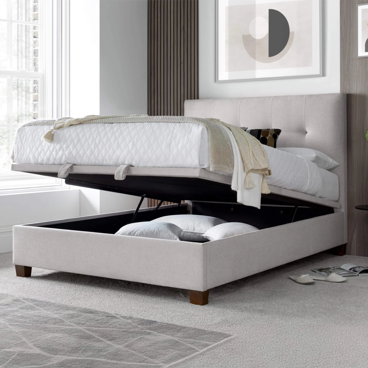Beyond it’s stylish appearance, this bed frame offers incredible functionality. The large open ottoman storage base provides a discreet and spacious solution for keeping your bedroom tidy, perfect for storing bedding, clothes and other items. Two convenient pull handles at the foot of the bed allow for easy lifting of the base to access the generous storage area. The mattress rests on a solid flat board, providing a stable and supportive foundation.